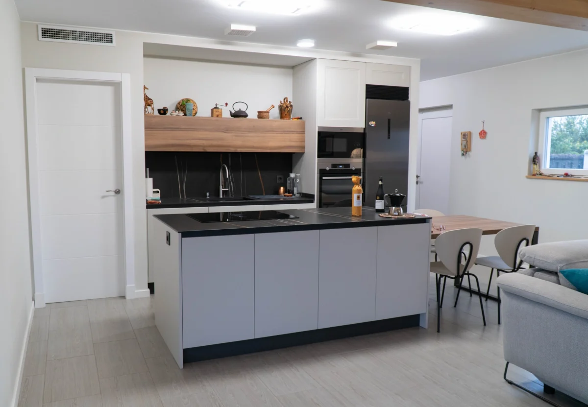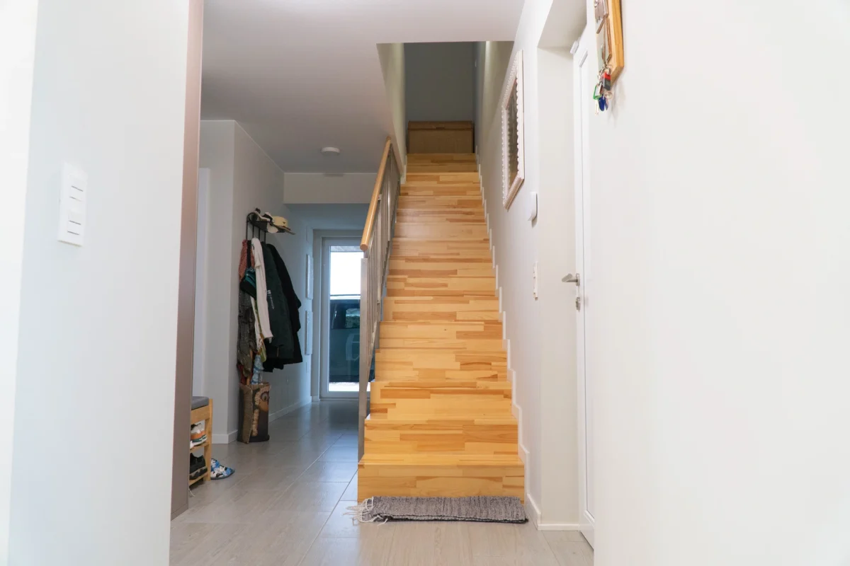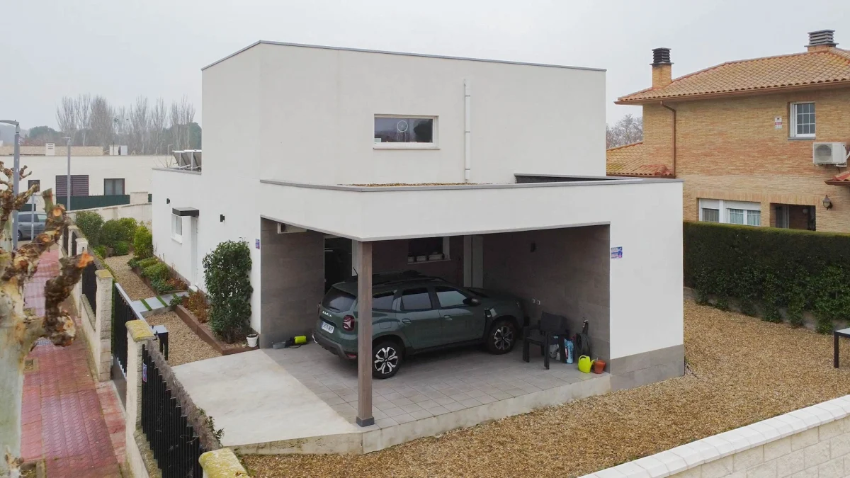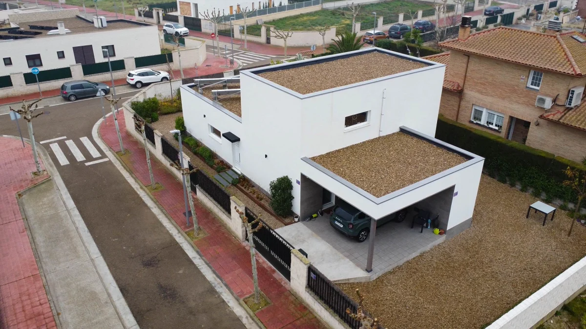 Vivienda unifamiliar construida bajo el estándar Passivhaus y Certificada, ubicada en Utebo (Zaragoza) localidad próxima a Zaragoza ciudad. Se trata de una vivienda de planta baja y planta primera, de líneas contemporáneas que forman diferentes volúmenes y cubierta plana con acabado superficial en grava. La zona de actividad diurna se desarrolla en planta baja con una grande balconera que da acceso al porche y jardín. A la edificación se adosa un taller y un garaje cubierto todo ello fuera de la envolvente pasiva. En su exterior, la fachada está con un revestimiento continuo de SATE y aplacados cerámicos. La estructura portante, de forjado y cubierta está realizado en entramado ligero, dejando ver poste y viga de madera laminada en el salón-comedor-cocina. La vivienda consta de una superficie cerrada de 166,55m2c y una superficie abierta de porche y garaje de 44,35m2c.