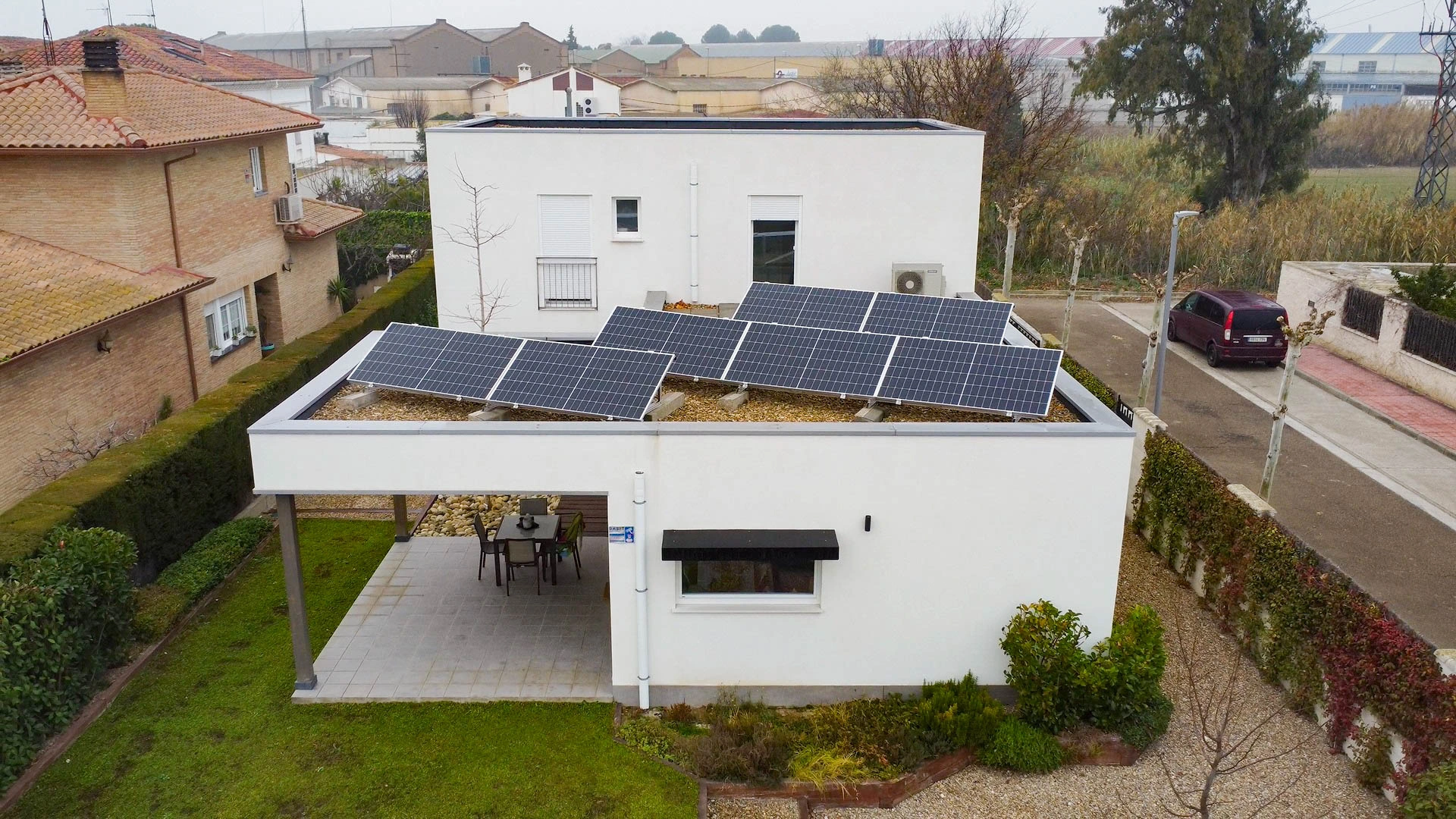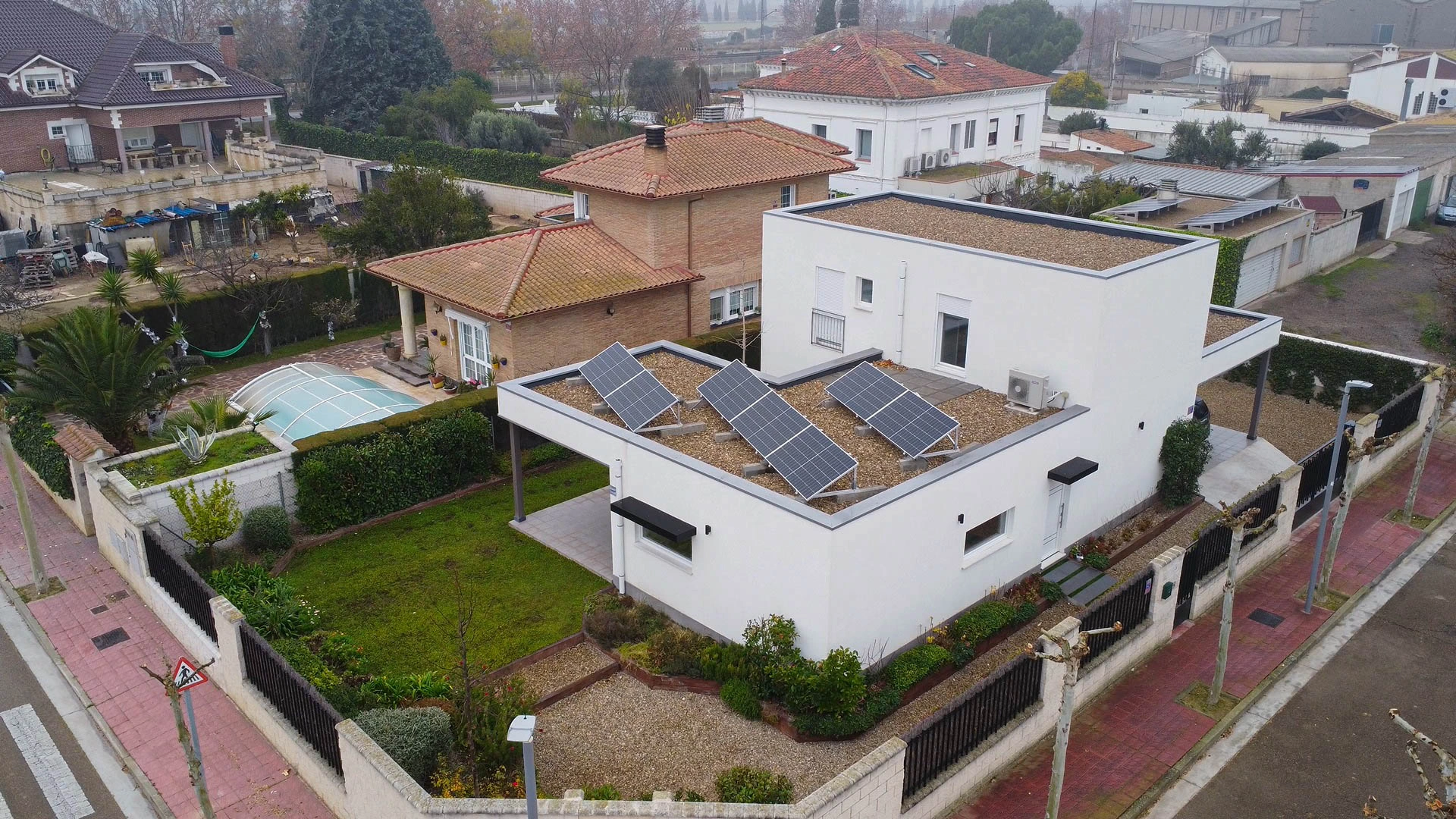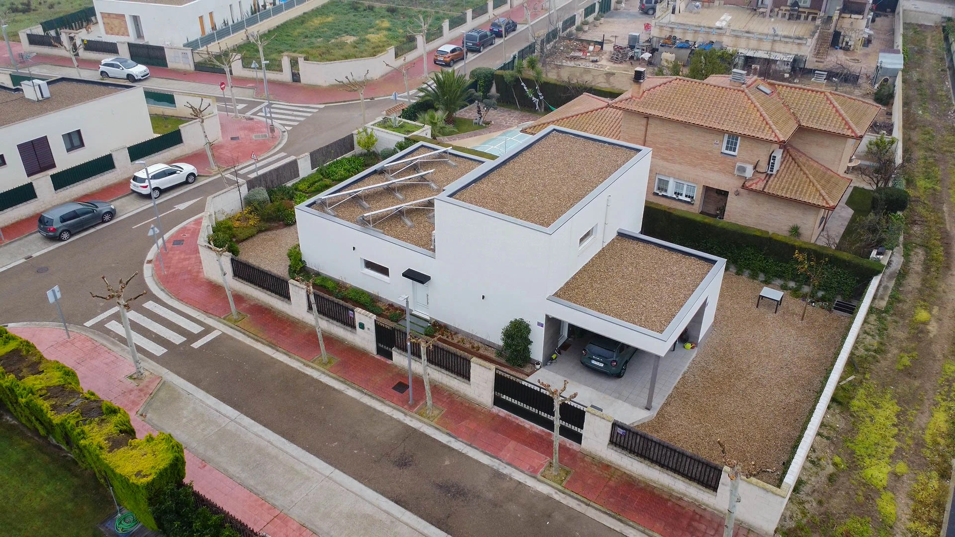 Vivienda unifamiliar construida bajo el estándar Passivhaus y Certificada, ubicada en Utebo (Zaragoza) localidad próxima a Zaragoza ciudad. Se trata de una vivienda de planta baja y planta primera, de líneas contemporáneas que forman diferentes volúmenes y cubierta plana con acabado superficial en grava. La zona de actividad diurna se desarrolla en planta baja con una grande balconera que da acceso al porche y jardín. A la edificación se adosa un taller y un garaje cubierto todo ello fuera de la envolvente pasiva. En su exterior, la fachada está con un revestimiento continuo de SATE y aplacados cerámicos. La estructura portante, de forjado y cubierta está realizado en entramado ligero, dejando ver poste y viga de madera laminada en el salón-comedor-cocina. La vivienda consta de una superficie cerrada de 166,55m2c y una superficie abierta de porche y garaje de 44,35m2c.